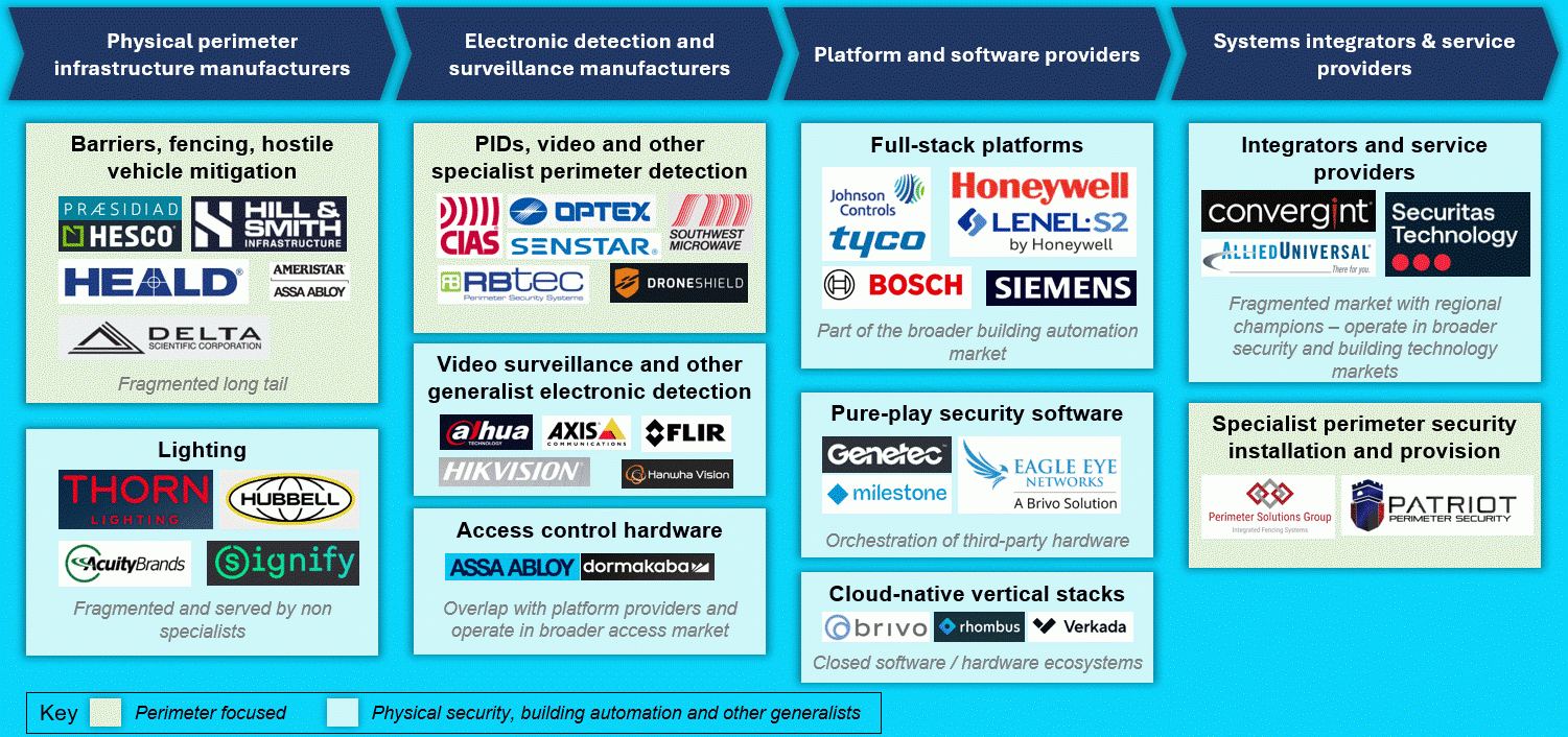 The perimeter security market is served by a fragmented manufacturing base, unified at the platform layer and delivered through local integrators. As solutions become more complex, integrators and service providers play a critical role in designing, deploying, and maintaining fully integrated systems.