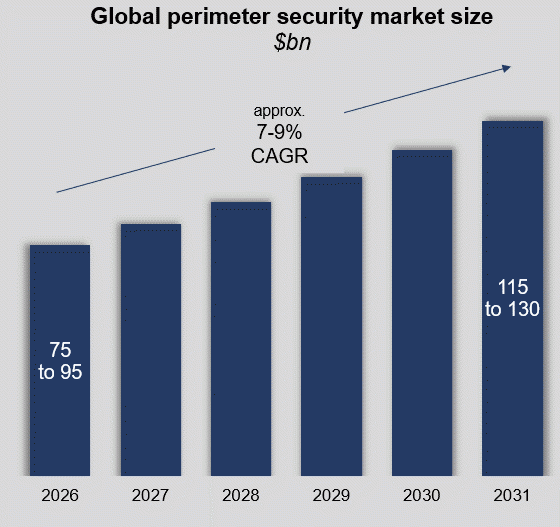Perimeter security is a fragmented, $75bn+ global market growing at high single‑digit rates, spanning physical infrastructure, electronic detection, sensing technologies, analytics platforms, and the integrators who design, install, and maintain them.